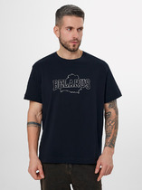 Футболка прямого силуэта. Горловина округлой формы обработана обтачкой из рибаны. Шов втачивания обтачки по спинке закрыт бейкой из основного полотна. Рукава втачные, корткие. Линия плеча слегка спущена.Нижние срезы футболки и рукавов обработаны швом вподгибку.