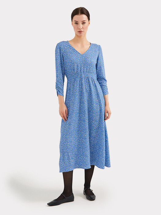Платье полуприлегающего силуэта из ткани рошель. Горловина V-образной формы. Платье отрезное по талии, с эластичной тесьмой внутри. По эластичной тесьме проложены отделочные строчки. По детали переда средний шов. Детали спинки со средним швом. Рукав втачной, длинный. По окату слегка присборен. Длина рукава  3\4, по низу рукава настрочена эластичная тесьма которая делает сборку. Низ платья расширяется к низу. Длина платья ниже колена.