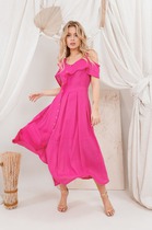В правом боковом шве обработан разрез. Низ платья асимметричный.