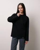 Свитшот прямого силуэта, свободный. Горловина круглой формы с обтачкой из рибаны. Рукава втачные длинные с отрезными манжетами из рибаны. Плечо спущено. По низу свитшота отрезной пояс из рибани и декоративная деталь из ткани имитирующая низ рубашки. Декоративная деталь по переду с застежкой на петли и пуговицы (на 4 прокола, d 10мм). Нижний срез фигурный.