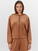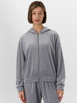 Толстовка свободного силуэта, укороченная. Горловина круглой формы с капюшоном. Капюшон цельнокроеный с подкладкой. На внешней стороне капюшона пробиты петли и вставлен шнур 8мм с эглетами (8EКXWCp-1). Шов втачивания капюшона закрыт бейкой из кулирки. Центральная застежка на тесьму-молнию. Рукава втачные длинные с отрезными манжетами из рибаны. Плечо спущено. На деталях переда вертикальные рельефы. В рельефах обработаны карманы. Подкладка кулирка. По низу отрезной пояс из рибаны.