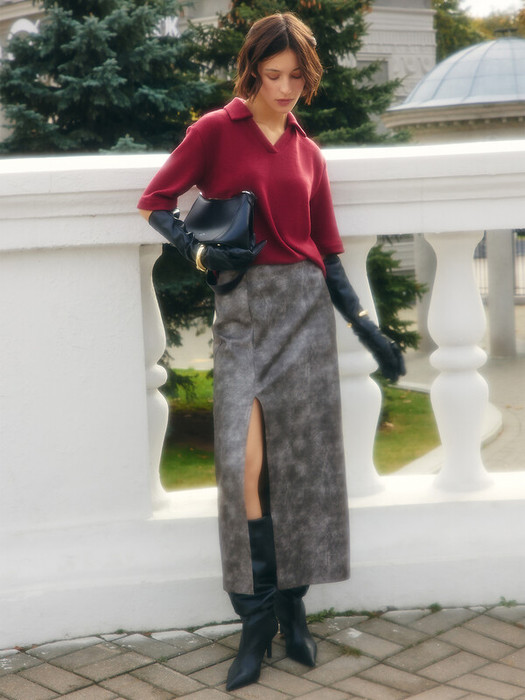 Юбка прямая, длиной миди. Верхний срез обработан обтачкой из основного полотна. Напередней и задней детали по верхнему срезу застрочены вытачки. По переду вертикальный рельеф с разрезом. В левом боковом шве застежка на потайную молнию. Нижний срез обработан вподгибку.