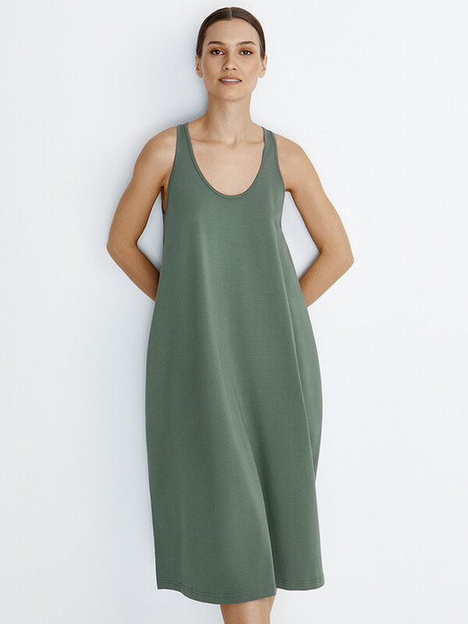 Женское платье «макси» А – силуэта с открытой проймой, глубоким круглым вырезом и карманами в боковых швах.