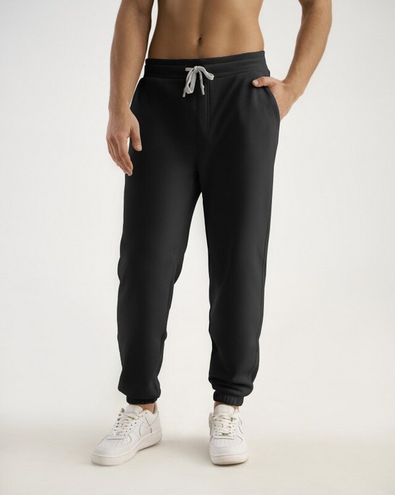 Мужские брюки, джоггеры с резинкой по низу брюк. Пояс из 2-х деталей, внутри резинка. По поясу отстрочка, петли,шнур. Боковые карманы с двойной отстрочкой, боковые швы отстрочены. Задний карман на правой задней половинке брюк.
