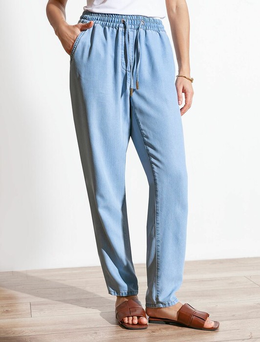 Брюки бананы светло-синего цвета выполнены из легкого джинсового лиоцелла плотностью 7,8 OZ и станут незаменимыми в гардеробе весной и летом. Благодаря свободному крою в области  бедер и слегка заужены к низу, они эффектно смотрятся и обеспечивают максимальный комфорт в течение всего дня. Пояс на резинке аккуратно фиксирует брюки на талии, не сковывая движения, а карманы по бокам добавляют практичности. Стильные бананы удачно скроют недостатки фигуры, подчеркивая достоинства, подойдутна большие размеры. Ткань сочетает прочность и мягкость лиоцелла с вискозой, что делает её невероятно комфортной, дышащей, устойчивой к сминанию и идеально подходящей для чувствительной кожи. Благодаря нежным тактильным ощущениям, будто шелк, от которого ощущается приятная прохлада, штаны отлично подходят для создания легких летних образов или стильных ансамблей на каждый день. Тонкие джинсы можно сочетать в стиле кэжуал, а также создавать монохромные образы или добавлять яркие акценты с помощью аксессуаров.  Эффектный фасон брюк