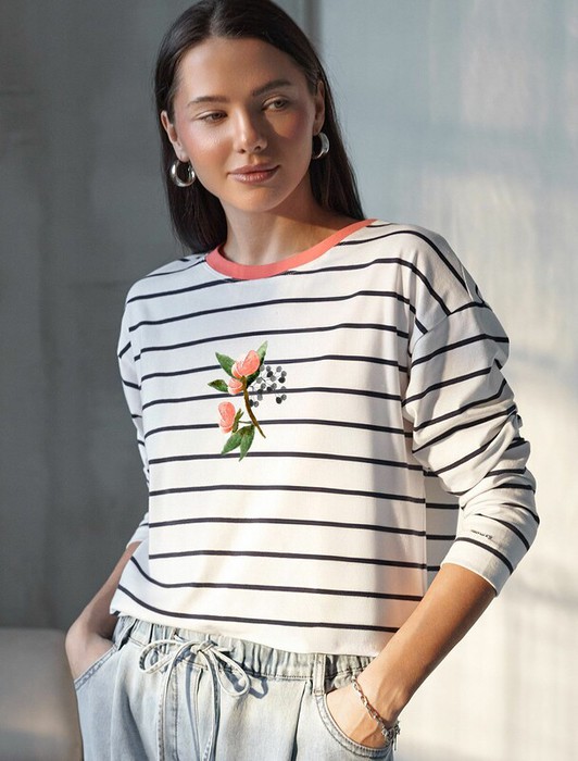 Совместные покупки Тюмень Женская одежда Джемперы, свитеры, водолазки — 22.03 Vilatte Лонгслив с принтом из премиального хлопка с эластаном D49.148 бел