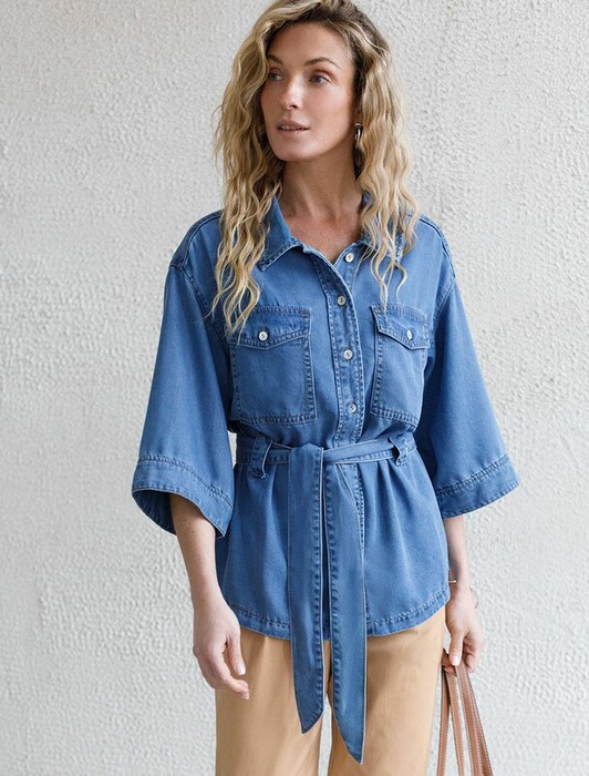 Эффектная удлиненная блузка светло-синего цвета с поясом выполнена из джинсового лиоцелла плотностью 7,8 OZ.. Универсальная модель идеально подходит для повседневной носки, пояс подчеркивает талию и скрывает небольшие недостатки фигуры, сохраняя при этом стильный вид. Отложной воротник создает аккуратный внешний образ, придавая классической рубашке элегантность. На груди расположены карманы, которые добавляют практичности. Ткань сочетает прочность и мягкость лиоцелла с вискозой, что делает её невероятно комфортной, дышащей, устойчивой к сминанию и идеально подходящей для чувствительной кожи. Благодаря нежным тактильным ощущениям, будто шелк, от которого ощущается приятная прохлада, рубашка отлично подходит для создания легких летних образов или стильных ансамблей на каждый день засчет своей универсальности. Широкий рукав средней длины гарантирует свободу движений и удобство на весь день.  Джинсовую блузку можно сочетать в стиле кэжуал, а также создавать монохромные образы или добавлять яркие акценты с помощью