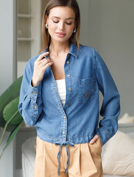 Укороченная стильная блузка светло-синего цвета с кулиской по низу выполнена из мягкого джинсового лиоцелла плотностью 7,8 OZ, который отлично держит форму и обеспечивает комфортную посадку на любую фигуру. Кулиска сформирует красивый силуэт, позволяя легко регулировать длину по желанию и подчеркнет достоинства фигуры, не стесняя движений. Короткая джинсовая рубашка на пуговицах с отложным воротником придаст образу стильный и современный вид. Практичная деталь — карман на груди с аккуратной вышивкой в виде логотипа бренда -  украшает изделие. Ткань сочетает прочность и мягкость лиоцелла с вискозой, что делает её невероятно комфортной, дышащей, устойчивой к сминанию и идеально подходящей для чувствительной кожи. Благодаря нежным тактильным ощущениям, будто шелк, от которого ощущается приятная прохлада, рубашка отлично подходит для создания легких летних образов или стильных ансамблей на каждый день засчет своей универсальности. Длинный рукав гарантирует свободу движений и удобство на весь день. Джинсовую блузк