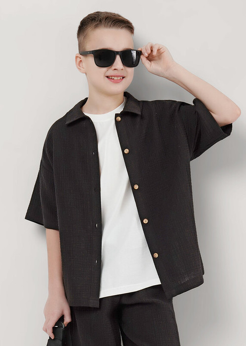 Муслиновая рубашка для мальчика в цветах хаки и чёрный: лёгкая хлопковая ткань, короткий рукав, застёжка на пуговицы. Комфортная, дышащая, подходит для тёплой погоды. Прямой крой не сковывает движения. Практичный вариант для повседневной носки.