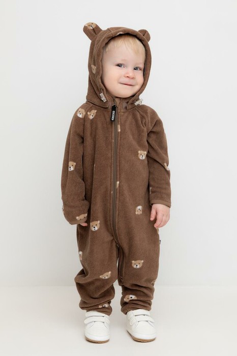 Флисовый комбинезон со съёмным капюшоном для мальчика. У изделия высокий воротник и съёмный капюшон на кнопках с декоративными ушками и подкладом из супрема. Застёгивается на удлинённую молнию. Предусмотрена защита шеи и подбородка. В размерах 40/62 - 48/74 на рукавах и штанинах есть удобные отвороты. Оригинальная набивка выполнена из стойких, гипоаллергенных текстильных красителей. Комбинезон сохраняет цвет и форму после многократных стирок.