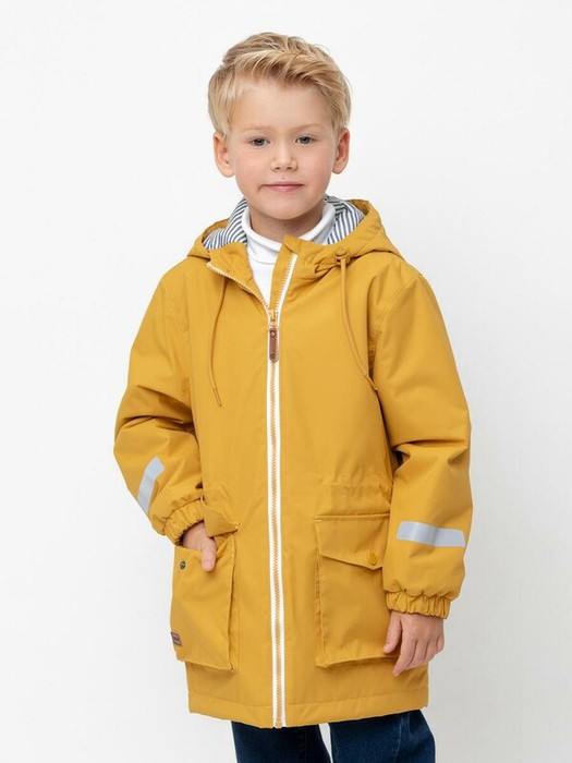 Демисезонная куртка для мальчика с утеплителем SEE®: 120 г/м2. Выполнена из мембранной ткани с дополнительной тефлоновой обработкой. Данный вид обработки предохраняет изделие от загрязнения и лучше отводит влагу. Подклад из 100% полиэстера. У изделия предусмотрена защита подбородка. Несъемный капюшон имеет эластичную утяжку со стопперами. Низ рукавов на эластичной резинке для лучшего прилегания. На талии утяжка при помощи шнура со стопперами. По бокам два накладных кармана с клапанами. Во всех изделиях верхнего ассортимента для безопасности ребенка предусмотрены светоотражающие элементы.