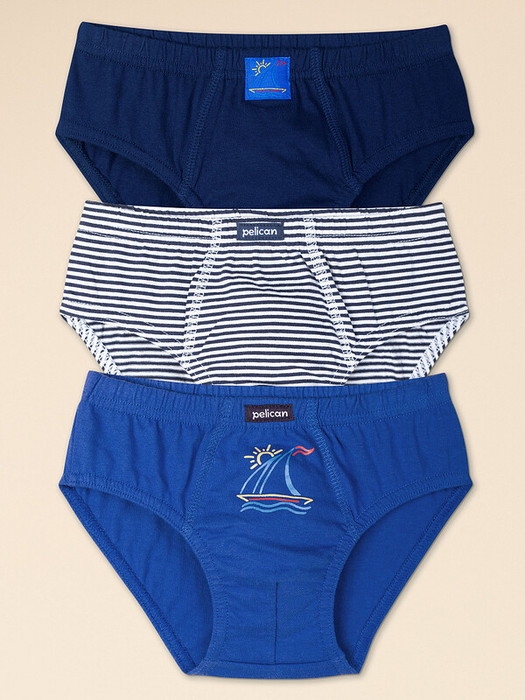 Выбирая бельё для своего ребёнка, любая мама заботится о его качестве и о том, чтобы ребёнку было удобно. Комплект трусов для мальчика (3 шт.) полностью соответствует этим запросам. В составе ткани 100% хлопка — трусы слипы приятны на ощупь, великолепно пропускают воздух, давая коже ребёнка дышать. Качественный натуральный материал и анатомически правильный крой гарантируют идеальную посадку на теле — ребёнку комфортно на протяжении всего дня. Мягкая широкая резинка в поясе исключает трение и дискомфорт. Трусы детские для мальчика представлены в трёх вариантах расцветки: в сине-белую полоску с нашивкой-лого на поясе, однотонные тёмно-синие с нашивкой с парусником на поясе и синие с небольшим принтом в виде симпатичного парусника по переду. Принт мягкий и устойчивый, отлично переносит частые стирки. Трусы слипы для мальчика превосходно сочетаются с любой одеждой. В линейке представлены хлопковые трусы следующих размеров: 1 (86); 2 (92); 3 (98); 4 (104); 5 (110); 6 (116); 7 (122); 8 (128); 9 (134); 10 (140); 11 (146). Модель подходит малышам, мальчикам дошкольного возраста, младшего школьного возраста и мальчикам-подросткам. Отличный вариант детского белья для повседневной носки, спорта и отдыха. Модные трусы станут хорошим подарком сыну или внуку. Выбирайте нужный размер по таблице размеров на фото. Цвет товара на экране вашего устройства может отличаться от цвета изделия вживую. Товар возврату и обмену не подлежит.