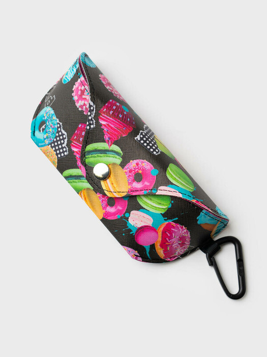 Чехол для солнцезащитных очков. Материал верха принтованная искуственная кожа. Яркий  принт пончики подходит под коллекцию. Чехол закрывается на кнопку. Внутри мягкая подкладка из микрофибры. Чехол имеет карабин,  с помощью которого чехол можно прикрепить на сумку или рюкзак. В подарок идет салфетка из микрофибры для протирки очков.  Параметры чехла: 16*7*4,5 см