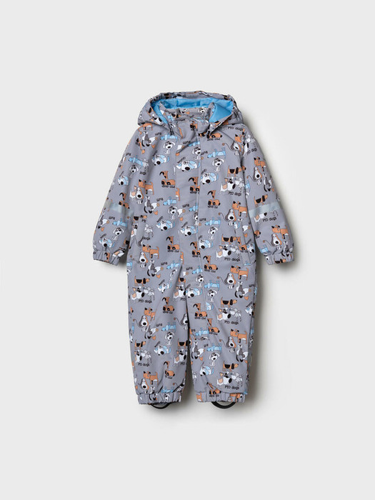 Лёгкий детский комбинезон для новорожденного мальчика. Температурный режим от +15°C до 0°C. Ткань с мембранным покрытием 5000х5000. Внутри мягкая подкладка из трикотажа. Ветрозащитная планка на липучках. Комбинезон украшен ярким принтом с мультяшными собаками и надписями. Съёмный капюшон на резинке. Манжеты на резинке. Два боковых кармана. Съемные эластичные штрипки. Для безопасности добавлены светоотражающие элементы по капюшону, рукавам и брючинам.