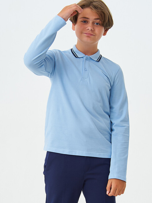 Поло из 100% хлопка с длинными рукавами, отложным воротником рубашечного типа, с центральной укороченной застежкой по переду на пуговицы. По краю воротника расположена контрастного цвета полоса.