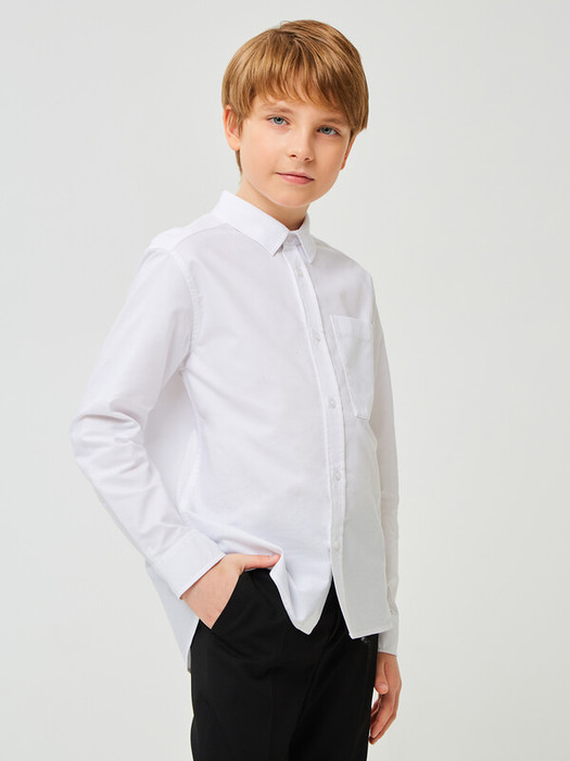 Сорочка для мальчика из смесового хлопка полуприлегающего силуэта. На спинке - кокетка. Воротник отложной со стойкой. Левая сторона полочки дополнена накладным карманом. Застёжка по центру переда на планку с кнопками. Рукава рубашечные со шлицами и манжетами.