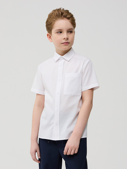 Сорочка для мальчика из смесового хлопка полуприлегающего силуэта с короткими рукавами. Воротник отложной со стойкой. Левая сторона полочки дополнена накладным карманом. Застёжка по центру переда на планку с кнопками.