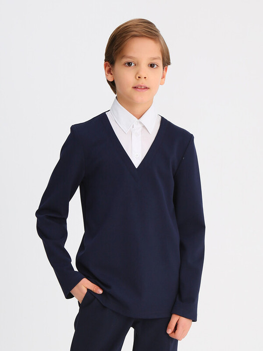 Джемпер трикотажный для мальчика прилегающего силуэта с имитацией манишки из сорочечной ткани контрастного цвета. Воротник отложной со стойкой. Укороченная застёжка на переде на планку с пуговицами. Рукава втачные длинные. Отличный вариант на каждый день.