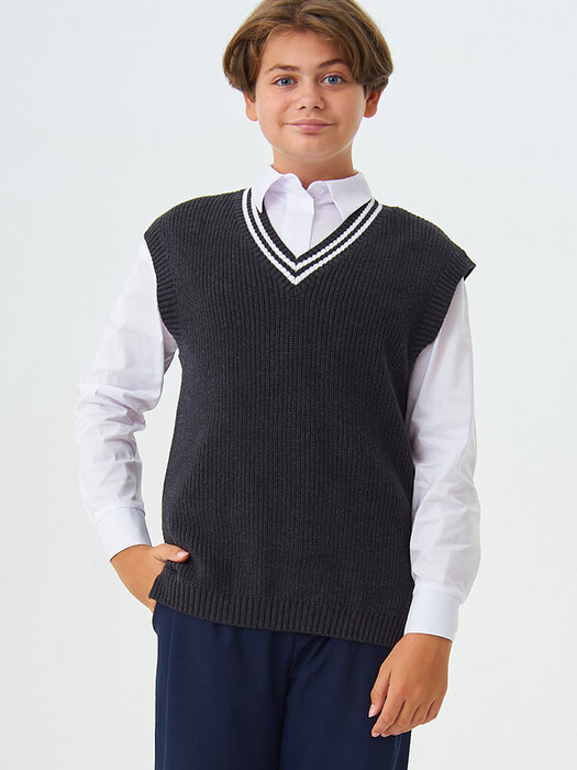 Стильный вязанный жилет с V-образным вырезом из хлопковой пряжи прямого фасона. Низ жилета, пройма рукавов и вырез горловины оформлены фактурной резинкой, вдоль горловины резинка контрастного цвета. Жилет выполнен из 100% хлопка, что обеспечивает отличную воздухопроницаемость и комфорт в повседневной носке.
