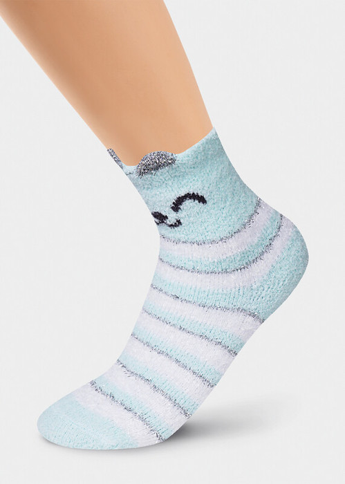 мягкие уютные носки из ""травки"" в полоску с люрексом, с мордочкой кошки и ушками 3Д
