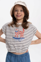 Футболка прямого силуэта для девочек с цельнокроеным рукавом. Нижние срезы рукавов с отворотами. Горловина круглой формы, обтачка из основного полотна. Шов притачивания обтачки закрыт бейкой из основного полотна. Низ изделия обработан на 2-х игольной плоскошовной машине швом в подгибку.