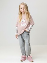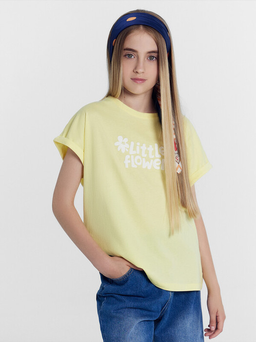Футболка прямого силуэта для девочек с цельнокроеным рукавом. Нижние срезы рукавов с отворотами. Горловина круглой формы, обтачка из основного полотна. Шов притачивания обтачки закрыт бейкой из основного полотна. Низ изделия обработан на 2-х игольной плоскошовной машине швом в подгибку.