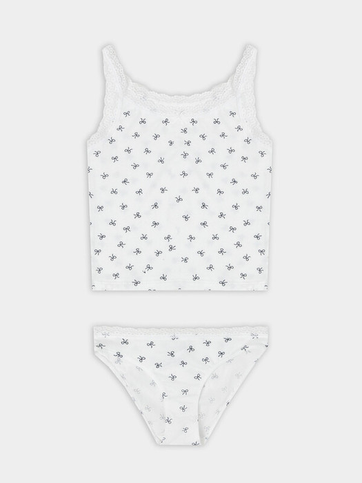Верхний край трусиков украшен таким же нежным кружевом, что и майка, а бантик завершает гармоничный дизайн.