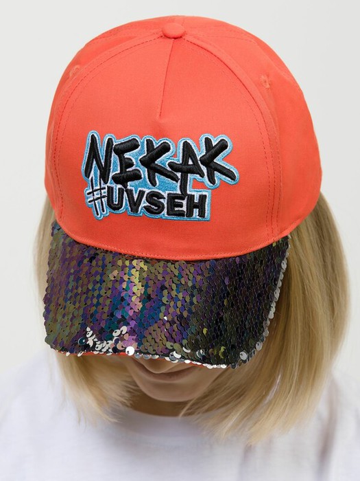 Кепка для девочек. Верх козырька кепки из двухсторонних пайеток фиолетового дуохрома и серебряного цвета. Текстовая вышивка. Перевод Не как все. Застежка велькро.