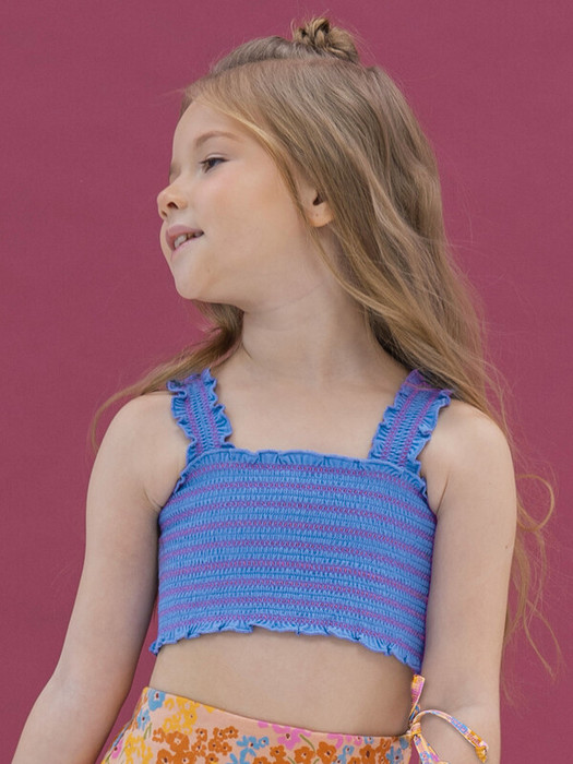 Кроп-топ из 100% хлопка для девочки. Ткань изделия дышащая и комфортная. По всей ширине модель украшена сборкой, которая выполнена эластичной нитью контрастного цвета — один из актуальных летних трендов. Кроп-топ лаконичного дизайна, поэтому его легко сочетать с различными шортами, юбками и леггинсами. С ним можно создать много разных образов. При этом он практически не займёт места в чемодане. Отличный выбор для летнего отдыха и путешествий.