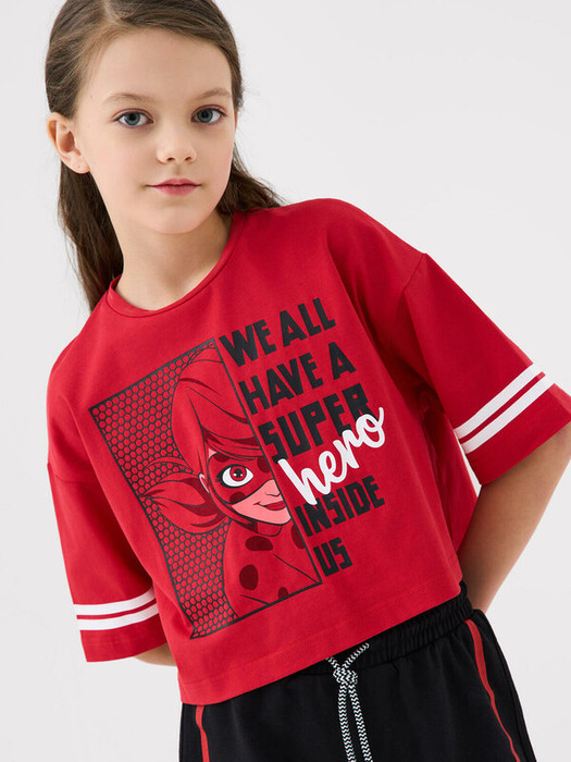 Футболка оверсайз для девочки подростка. Модель выполнена из эластичного хлопкового трикотажа джерси. На груди расположен крупный принт с изображением героя из любимого мультика "Леди Баг и Супер-Кот". Горловина круглая.