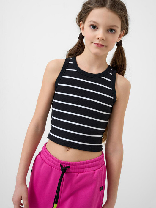 Майка укороченная в полоску для девочки подростка. Модель прямого силуэта, без рукавов, с круглой горловиной. Выполнена из хлопкового трикотажа в рубчик.