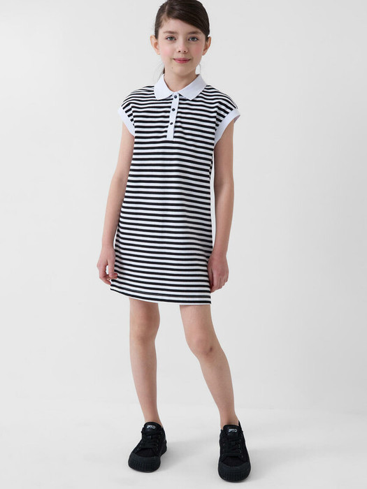 Платье-поло для девочки подростка. Выполнено из мягкого хлопкового трикотажа пике. Прямой силуэт и короткие рукава. У модели классический рубашечный воротник, планка на кнопках и аккуратные манжеты. Длина — чуть выше колена.