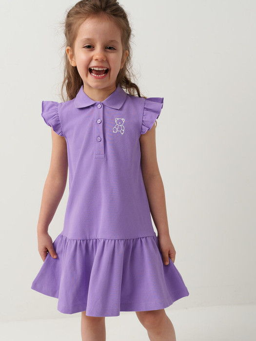 Летнее детское платье-поло для девочки. Выполнено из мягкого хлопкового трикотажа пике. Короткие рукава-крылышки, классический воротник поло и застежка на кнопки спереди. По низу — присборенная юбка, создающая нежный силуэт. Милый принт с медведем.
