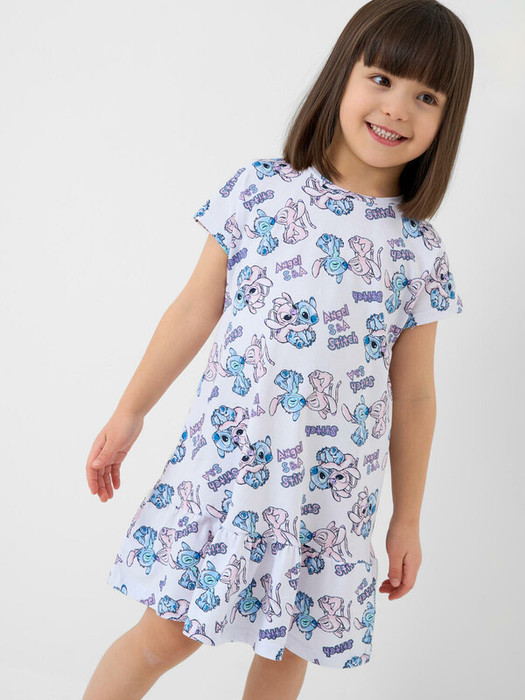 Детская ночная сорочка для девочки. Выполнена из мягкого хлопкового трикотажного материала. Модель прямого кроя, с короткими рукавами и широким воланом по низу, что придаёт ей воздушность и дополнительный объём. Горловина круглая, аккуратно обработана кантом. Главной особенностью дизайна является яркий и весёлый принт с персонажами Лило и Стич.
