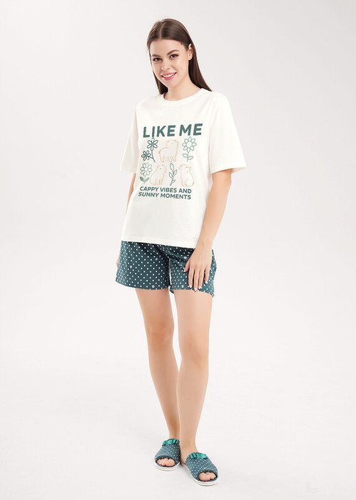Набор одежды для дома и отдыха из хлопкового трикотажного полотна. Футболка прямого кроя, короткий втачной рукав, округлая горловина с обтачкой. Спереди принт. Короткие шорты свободного кроя, цельнокроеный пояс на внутренней резинке. Боковые разрезы.