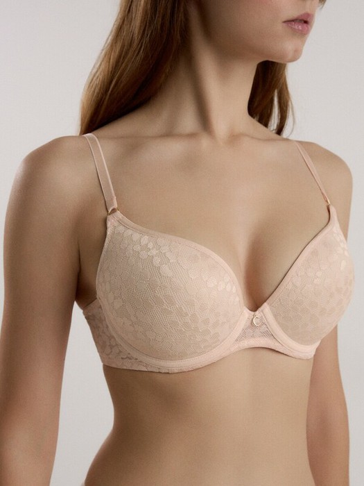 Бельё серии Sunny Rain из эластичного кружевного полотна с абстрактным жаккардовым рисунком, деликатным блеском и утончёнными деталями создаёт гармоничное сочетание комфорта и элегантности. Благодаря формованной чашке с push-up эффектом бюстгальтер придаст дополнительный объем груди и подчеркнёт изящную линию декольте.