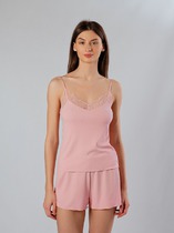 Комплект женский состоит из блузы и брюк. Блуза на тонких бретелях прямая, свободная. Бретели с регулировкой на регуляторы и кольца (пластик 6мм). Верхний срез обработан обтачкой из основного полотна. На передних половинках застрочены вытачки. По переду застежка на завязки.