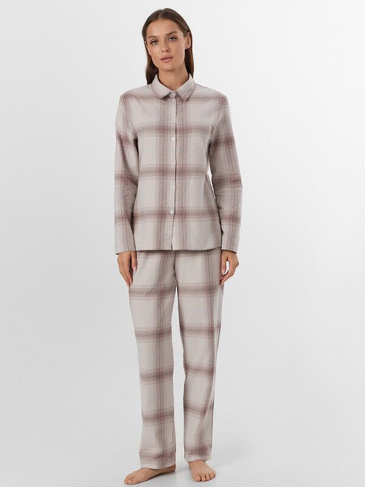 Брюки с широким эластичным поясом мягко сидят на талии, не оставляя следов, а клетчатый рисунок придает образу теплоту и домашний шарм. Этот комплект подойдет для сна, утреннего кофе или отдыха с книгой — он сочетает практичность и стиль.