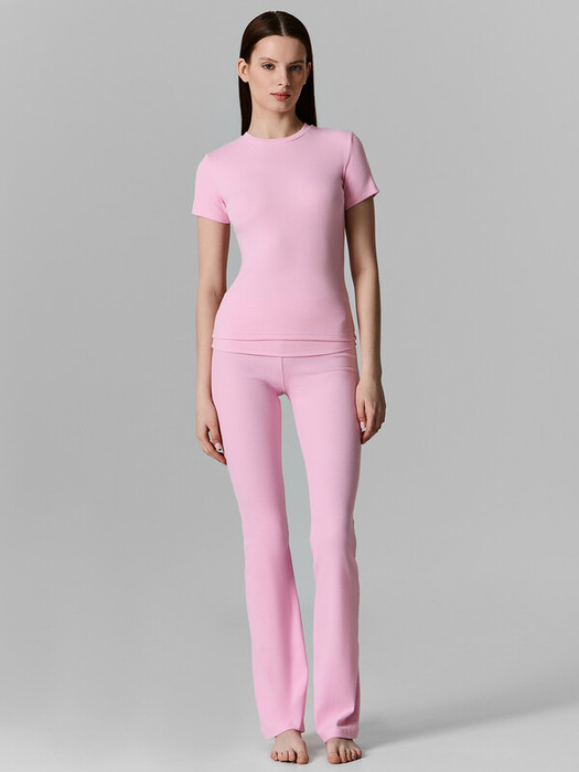 Комплект состоит из джемпера и брюк. Джемпер прилегающего силуэта. Горловина круглой формы обработана обтачкой из основного полотна, шов втачивания обтачки по спинке закрыт бейкой из основного полотна. Рукава втачные короткие. Нижний срез джемпера и рукавов обработан швом вподгибку. Брюки клеш, посадка средняя. Пояс отрезной широкий с отворотом. По шву втачивания отворота в припуск вставлена эластичная тесьма 6мм (жилка тканая WT4-6 Arteks  E7112). Нижний срез брюк обработан швом вподгибку.
