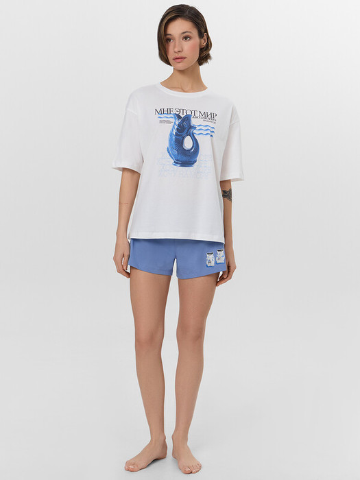 Домашняя пижама с принтом создает атмосферу уютного праздника. Этот набор из футболки и шорт станет верным спутником ваших расслабленных вечеров.
