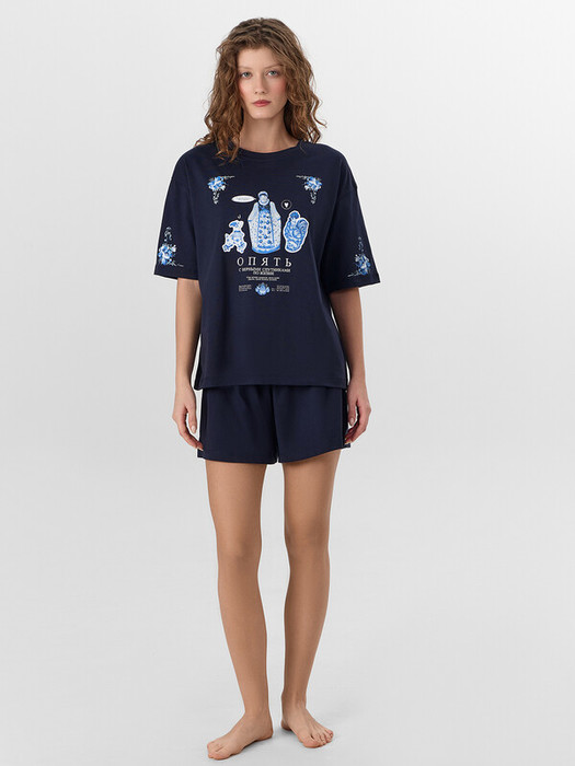 Домашняя пижама с принтом создает атмосферу уютного праздника. Этот набор из футболки и шорт станет верным спутником ваших расслабленных вечеров.
