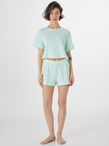 Комплект женский состоит из джемпера и шорт. Джемпер прямой, свободный. Горловина круглая обработана обтачкой из основного полотна. Рукава втачные, короткие. Нижние срезы джемпера и рукавов обработаны швом вподгибку. Шорты короткие, свободные. Посадка высокая. Пояс цельнокроеный с эластичной тесьмой внутри (внутренняя 30мм 30RV). Нижние срезы шорт обработаны швом вподгибку.
