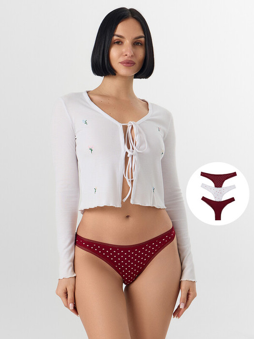 Набор женских трусов бразилиана — сочетание комфорта и элегантного дизайна! Модели со средней посадкой обеспечивают комфорт в течение дня, мягко повторяя линии фигуры. Изделие выполнено из нежной хлопковой кулирки, которая приятно прилегает к коже, обладает высокой воздухопроницаемостью и дарит ощущение легкости. Задняя часть со средним швом обеспечивает хорошую посадку и аккуратный внешний вид. Верхний и нижний срезы обработаны эластичной тесьмой, что делает трусики еще более удобными и помогает им сохранять форму.Такой набор идеально подходит для повседневного ношения, сочетая нежность, качество и стиль. Выберите для себя удобные и красивые модели, которые подчеркнут вашу естественную привлекательность и подарят комфорт на весь день!