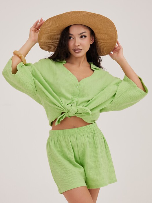 Домашний костюм из жатого муслина (100% хлопок) цвета нежных зеленых листочков состоит из рубашки и  шорт. Рубашка на пуговицах, с V-образным вырезом и отложным воротником, с коротким рукавом и разрезами по бокам. По срезу рукава и низа - подгиб со строчкой. Широкие короткие шорты не резинке. Низ шорт с подгибом и строчкой.