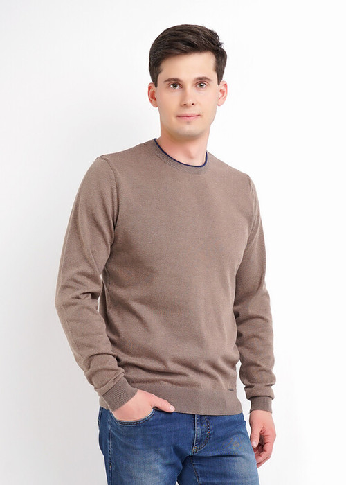 Мужской вязаный джемпер с круглым вырезом горловины в базовом ассортименте. Модель завершенная благодаря двойной контрастной горловине, декоративной полосатой тесьме и провязаной обтачке по спинке. Модель дополняет металлофурнитура по низу.