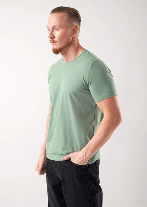 Базовая однотонная футболка стандартного объема с круглой горловиной, втачным рукавом из хлопкового полотна с добавлением эластана. Является неотъемлемой частью мужского гардероба.