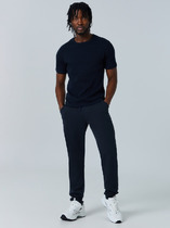 Брюки мужские изготовлены из футера 3-х нитки (без подчёса).Брюки слегка зауженные книзу, посадка средняя. Пояс из рибаны. С внешней стороны пробиты петли и втянут шнур с эглетами (8EKXWCp-1). На деталях переда защипы. По переду карманы с отрезными бочками. Нижние срезы брюк обработаны швом вподгибку.На правой детали спинки накладной карман.