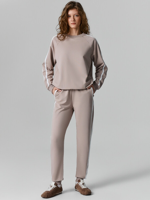 Спортивный комплект из футера без подчеса. В составе полотна – натуральный хлопок, немного полиэстера для прочности и эластана, который дарит свободу движений при нагрузках. Джемпер прямого силуэта, с длинными рукавами на манжетах, эластичным поясом на нижнем срезе и лампасами. Брюки зауженного к низу силуэта, на манжетаха, с лампасами и боковыми карманами. Широкий пояс из рибаны со шнурком-завязкой дарит особый комфорт во время занятий спортом и отдыха.