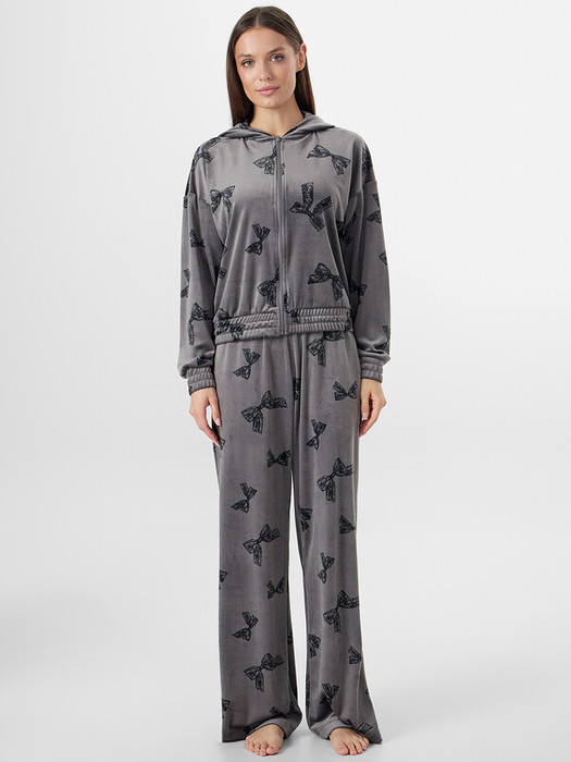 Комплект женский, состоит из толстовки и брюк. Толстовка свободного силуэта с капюшоном, спинка цельнокроеная. Горловина круглой формы. Капюшон двойной с выточкой (как на образце). Шов горловины спинки и молния закрыт х/б тесьмой 1см. Плечо слегка спущено, пройма углублена. По низу рукава отрезная манжета из основного полотна. Низ толстовки с притачным поясом из основного полотна. На поясе и манжетах 2 отделочные строчки. Перед с центральной застежкой на молнию.
