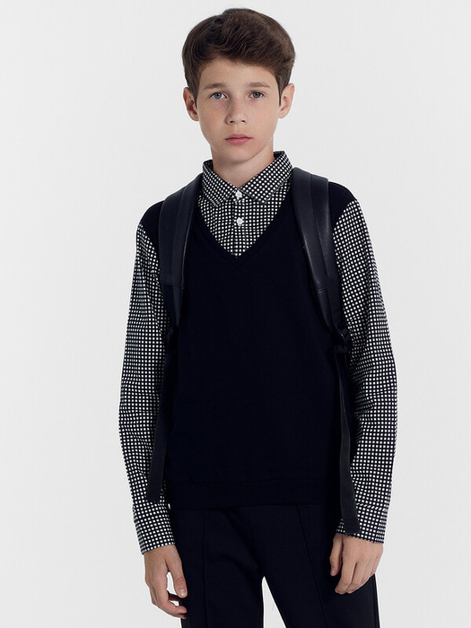 Стильный джемпер прямого силуэта для мальчиков. Вырез V-образной формы, с декоративной текстильной манишкой на пуговицах  и воротником-стойкой. Рукава с манжетами и застежкой на пуговицу. Джемпер имитирует рубашку, поддетую под жилет, и отлично подходит для школы!